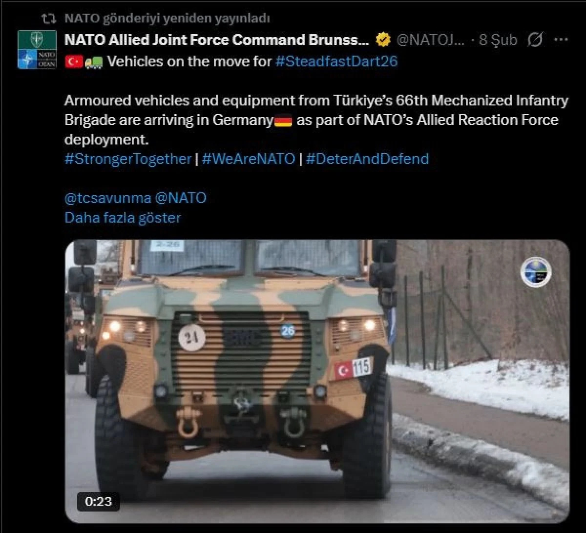 “Türkiye’nin 66. Mekanize Piyade Tugayı’na ait zırhlı araçlar ve teçhizat, NATO’nun Müttefik Tepki Gücü konuşlandırmasının bir parçası olarak Almanya’ya geliyor. #BirlikteDahaGüçlüyüz“